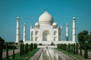 Emblématique, en effet. La pureté de son marbre blanc, la richesse de ses sculptures et la symétrie de ses jardins font du Taj Mahal une merveille d’architecture moghol, d’inspirations islamique, iranienne, perse et indienne inscrit au patrimoine mondial de l’UNESCO depuis 1983. Conçu comme le reflet terrestre et symbolique du Jardin de Paradis mentionné dans le Coran, ce vaste complexe architectural est un ensemble de bâtiments, de jardins, de plans d’eau et de fontaines. Il comprend deux mosquées, trois portes de style iranien, 3 bâtiments de briques rouges, une fontaine centrale et 4 plans d’eau organisés en croix. Son mausolée est également coiffé d’un dôme en bulbe à double coque issu d’Asie centrale.